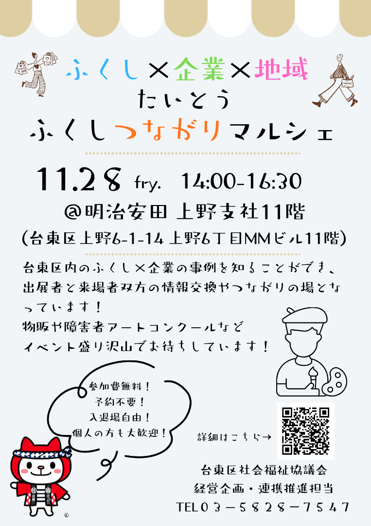 自主製品等を制作している台東区内の障害福祉施設などのブース出展や既に台東区内でふくしと連携している企業にブース出展していただき、台東区における、ふくし×企業の事例をより多くの企業や個人に知っていただくとともに、出展者・来場者双方の情報交換やつながり作りの場となっています。施設の紹介や企業の取組み紹介も兼ねたアートコンクールも開催されます。