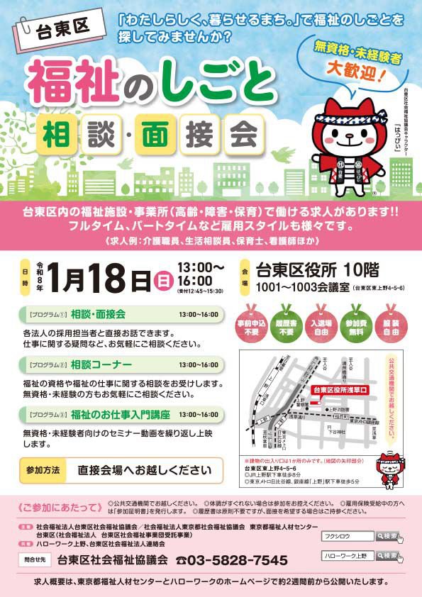 | 内容 | 区内の施設・事業所の採用担当者とお話し、仕事に関する疑問などを直接聞くことができます。 予約不要、参加費無料、入退場・服装自由です。 資格なし・未経験の方もお気軽にどうぞ。 《日時》 令和8年1月18日(日)13:00~16:00 受付開始12:45 / 受付終了15:30 《内容》 ◯相談・面接会 各法人の採用担当者と直接お話できます。 仕事に関する疑問や求人の詳細について個別に相談や質問ができます。 ◯相談コーナー 福祉の資格や福祉の仕事に関する相談をお受けします。 無資格・未経験の方もお気軽にご相談ください。 ◯福祉のお仕事入門講座 無資格・未経験者向けのセミナー動画を繰り返し上映します。 |