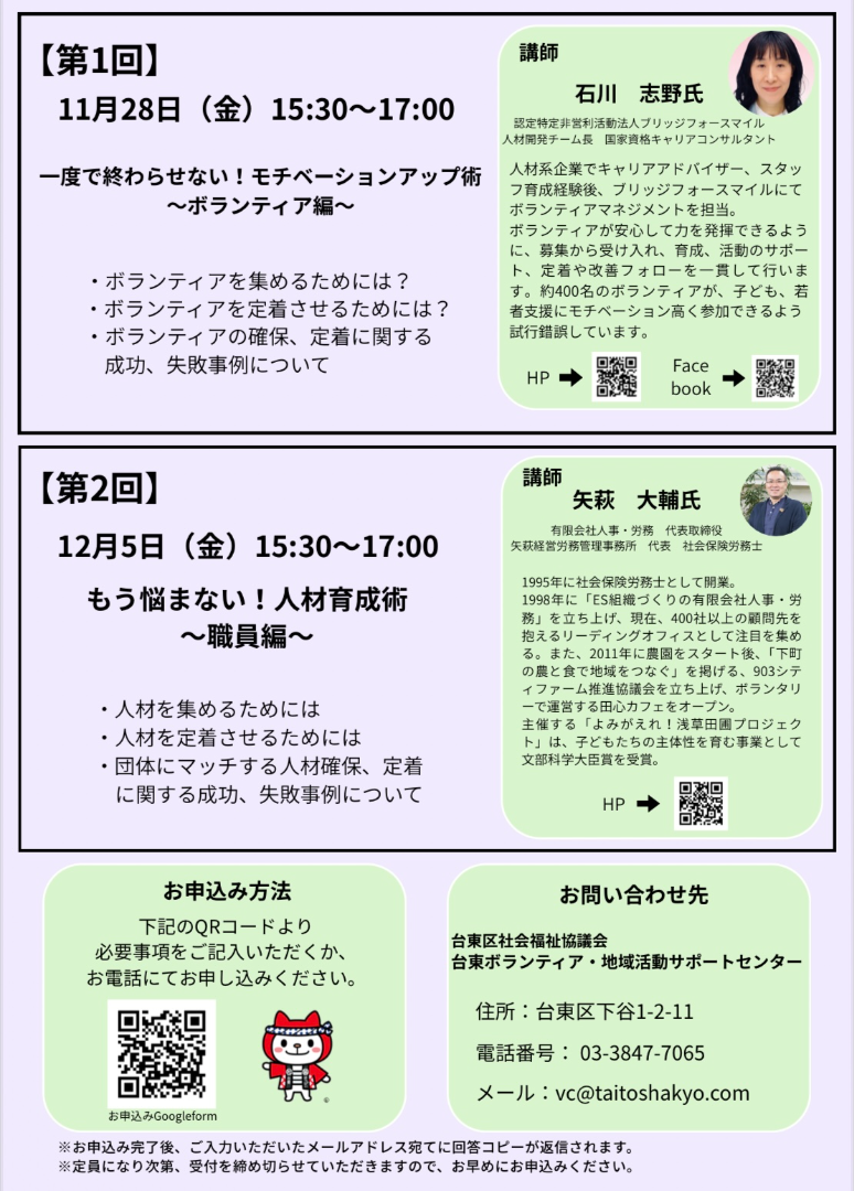 | 内容 | 【テーマ】 第1回 一度で終わらせない!モチベーションアップ術~ボランティア編~ 第2回 もう悩まない!人材育成術~職員編~ 【日時】 第1回 11月28日(金)15:30~17:00 第2回 12月5日(金)15:30~17:00 【対象】 センター登録団体 台東区内の非営利活動団体(法人格は問いません) 【講師】 第1回 認定特定非営利活動法人ブリッジフォースマイル 石川志野 様 第2回 ES組織づくりの有限会社 人事・労務 矢萩大輔 様 |