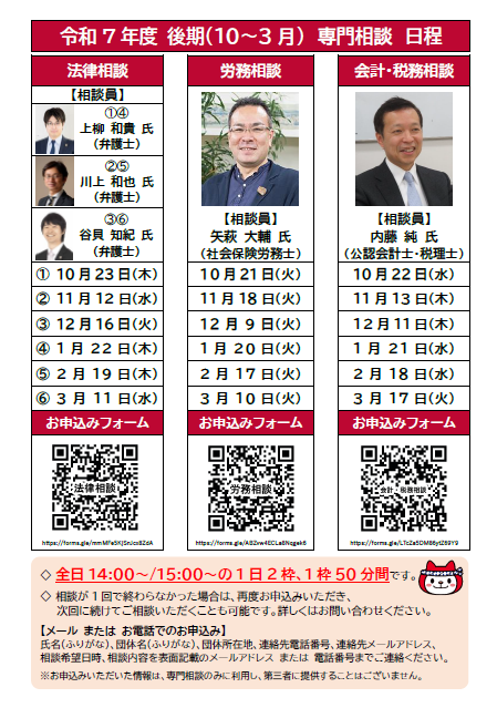 お申込方法 | チラシ裏面のQRコードまたはURLよりお申込みください。 【メールまたはお電話でのお申込み】 各相談日の1週間前までに下記の①~⑦の必要事項をお教えください。 ①氏名(ふりがな) ②団体名(ふりがな) ③団体所在地 ④電話番号 ⑤メールアドレス ⑥相談希望日時 ⑦相談内容 |